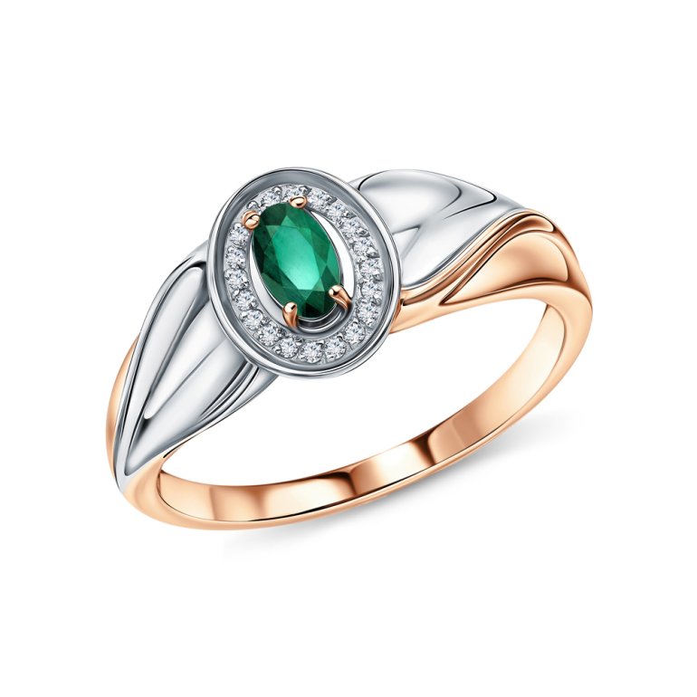 Кольцо с 20 бриллиантами природными, 0.043 карат, огранка круг 17 граней, цвет 2, чистота 2, тип огранки А; 1 изумрудом природным, 0.199 карат, цвет 3, чистота 3, тип огранки Б; Розовое золото 585 пробы.