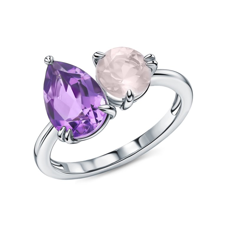 Кольцо с 1 аметистом природным, 1.7 карат; 1 кварцем розовым природным, 0.9 карат; Серебро 925 пробы.