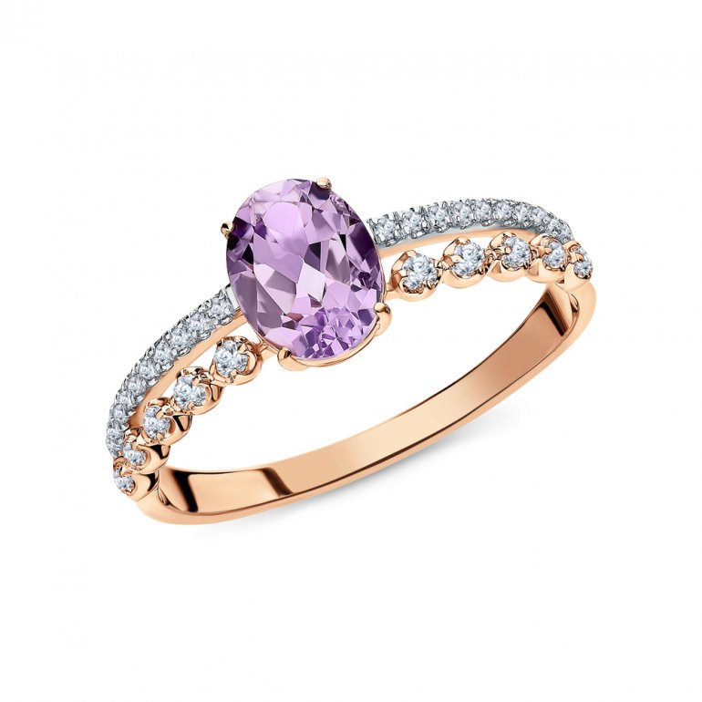 Кольцо с 1 аметистом природным, 0.94 карат, тип огранки Б; 10 топазами бесцветными природными, 0.166 карат, тип огранки В; 20 бриллиантами, 0.076 карат, огранка круг 17 граней, цвет 2, чистота 2, тип огранки Б; Розовое золото 585 пробы.