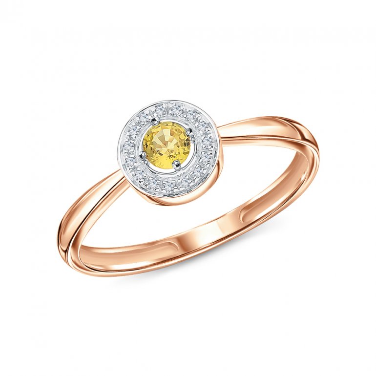 Кольцо с 15 бриллиантами природными, 0.039 карат, огранка круг 17 граней, цвет 2, чистота 2, тип огранки Б; 1 сапфиром желтым природным, 0.222 карат; Розовое золото 585 пробы.
