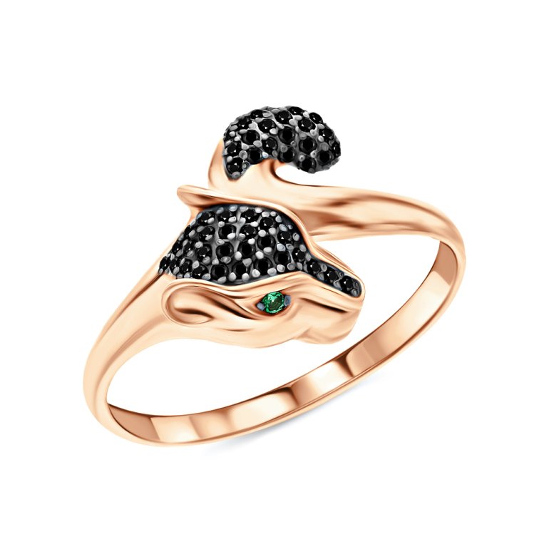 Кольцо, вставка: черным фианитом;  фианит зеленый; Розовое золото 585 пробы.