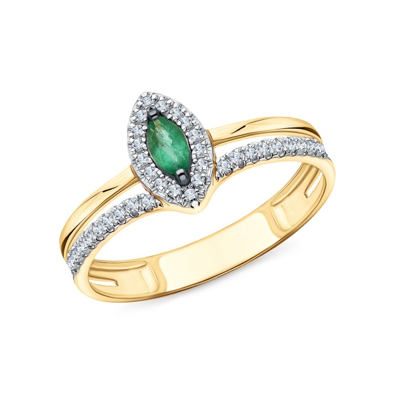 Кольцо с 34 бриллиантами природными, 0.12 карат, огранка круг 17 граней, цвет 2, чистота 2, тип огранки А; 1 изумрудом природным, 0.115 карат, цвет 4, чистота 3, тип огранки Б; Желтое золото 585 пробы.