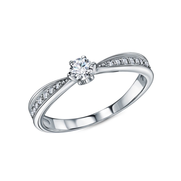 Кольцо с 1 бриллиантом, 0.147 карат, огранка круг 57 граней, цвет 3, чистота 6, тип огранки А; 8 бриллиантами, 0.055 карат, огранка круг 57 граней, цвет 3, чистота 6, тип огранки А; 4 бриллиантами, 0.017 карат, огранка круг 17 граней, цвет 2, чистота 2, тип огранки А; Белое золото 585 пробы.