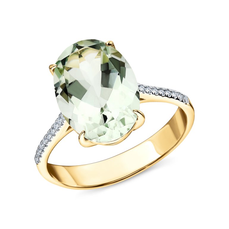 Кольцо с 1 празиолитом, 4.909 карат, тип огранки Б; 18 бриллиантами, 0.063 карат, огранка круг 17 граней, цвет 2, чистота 2, тип огранки А; Желтое золото 585 пробы.