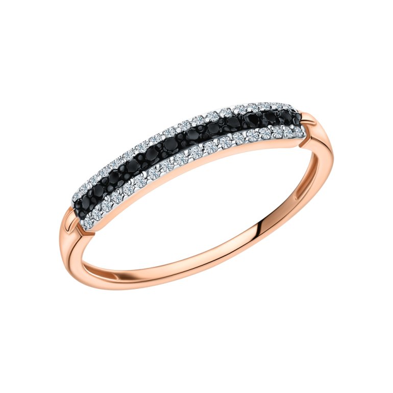 Кольцо с 36 бриллиантами природными, 0.067 карат, огранка круг 17 граней, цвет 2, чистота 2, тип огранки Б; 12 бриллиантами черными природными облагороженными, 0.096 карат, огранка круг 57 граней, цвет 7, чистота 6, тип огранки А; Розовое золото 585 пробы.