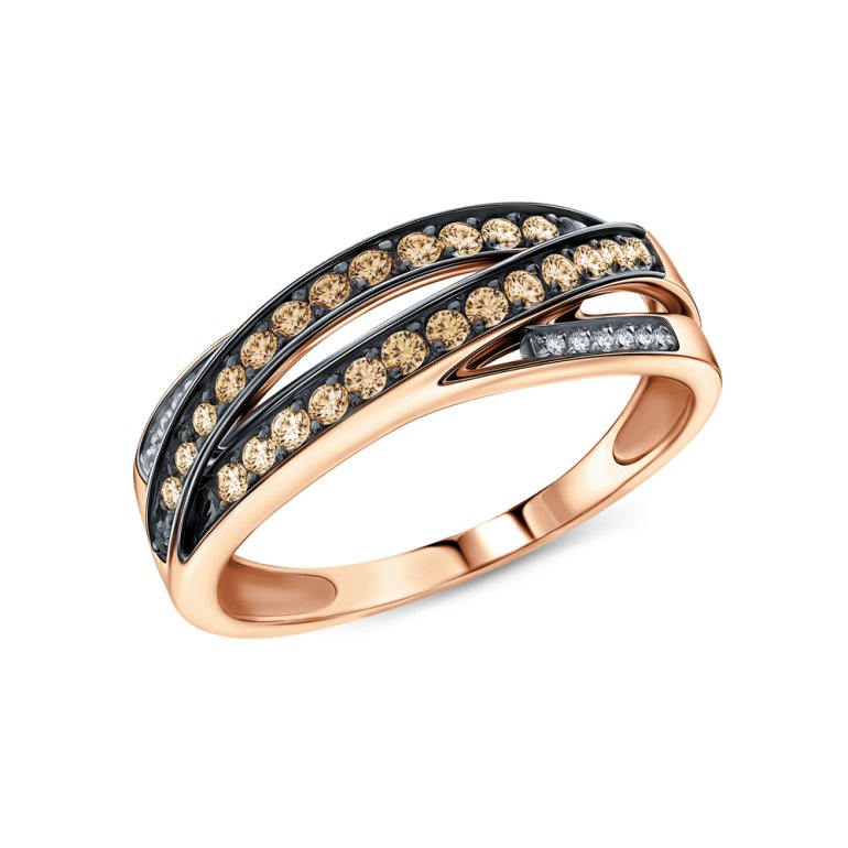 Кольцо с 12 бриллиантами природными, 0.025 карат, огранка круг 17 граней, цвет 2, чистота 2, тип огранки А; 26 бриллиантами коньячными природными, 0.309 карат, огранка круг 57 граней, цвет 7, чистота 5, тип огранки А; Розовое золото 585 пробы.