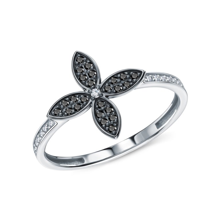 Кольцо с 1 бриллиантом природным, 0.007 карат, огранка круг 17 граней, цвет 2, чистота 2, тип огранки А; 14 бриллиантами природными, 0.058 карат, огранка круг 17 граней, цвет 2, чистота 2, тип огранки А; 24 бриллиантами черными природными облагороженными, 0.095 карат, огранка круг 57 граней, цвет 7, чистота 6, тип огранки А; Белое золото 585 пробы.