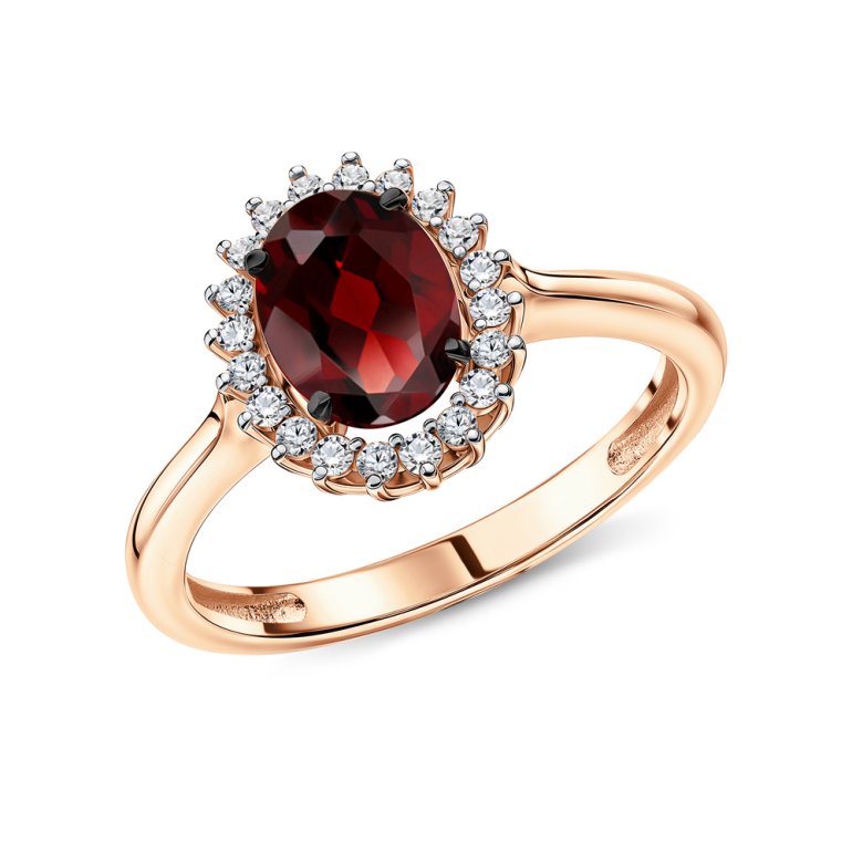 Кольцо с 1 гранатом природным, 1.75 карат, тип огранки Б; фианитом бесцветным; Розовое золото 585 пробы.