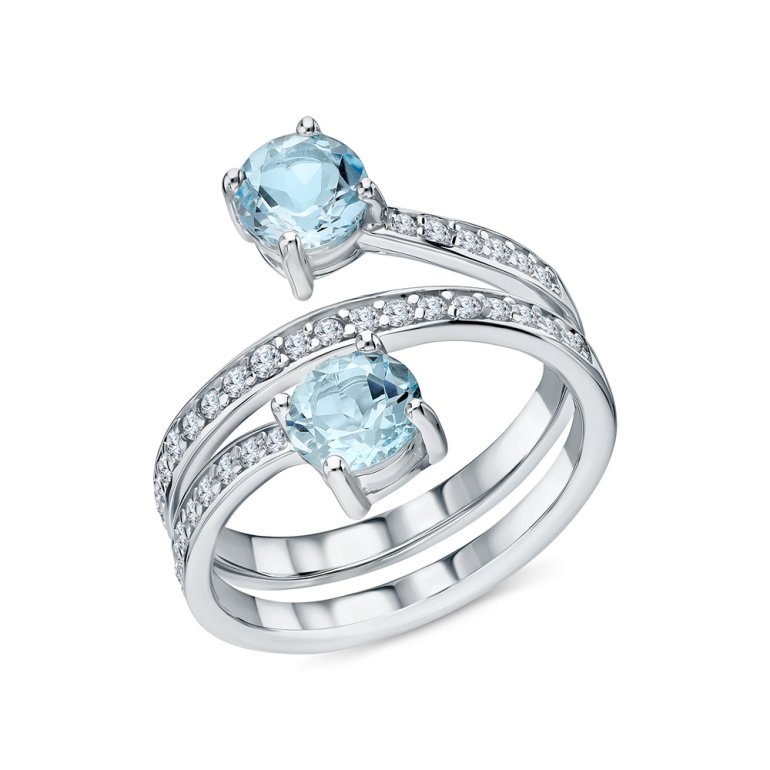 Кольцо с 2 топазами скай природными, 2. карат;  фианитом бесцветным; Серебро 925 пробы.