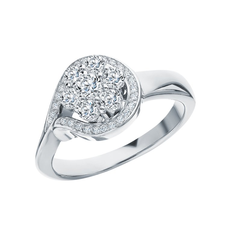 Кольцо с 1 бриллиантом, 0.097 карат, огранка круг 57 граней, цвет 3, чистота 6, тип огранки А; 6 бриллиантами, 0.325 карат, огранка круг 57 граней, цвет 3, чистота 6, тип огранки А; 26 бриллиантами, 0.078 карат, огранка круг 57 граней, цвет 3, чистота 6, тип огранки А; Белое золото 585 пробы.