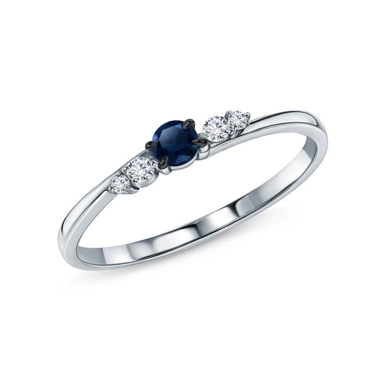 Кольцо с 1 сапфиром, 0.123 карат, цвет 2, чистота 2, тип огранки В; 2 бриллиантами, 0.045 карат, огранка круг 57 граней, цвет 3, чистота 6, тип огранки А; 2 бриллиантами, 0.018 карат, огранка круг 57 граней, цвет 3, чистота 6, тип огранки А; Белое золото 585 пробы.