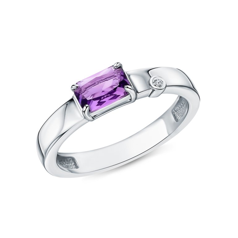 Кольцо с 1 бриллиантом природным, 0.004 карат, огранка круг 17 граней, цвет 2, чистота 2, тип огранки А; 1 аметистом природным, 0.479 карат, тип огранки Б; Серебро 925 пробы.