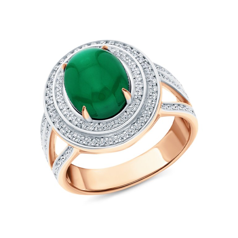 Кольцо с 112 бриллиантами, 0.274 карат, огранка круг 17 граней, цвет 2, чистота 2, тип огранки А; 1 агатом зеленым, тип огранки Б; Розовое золото 585 пробы.