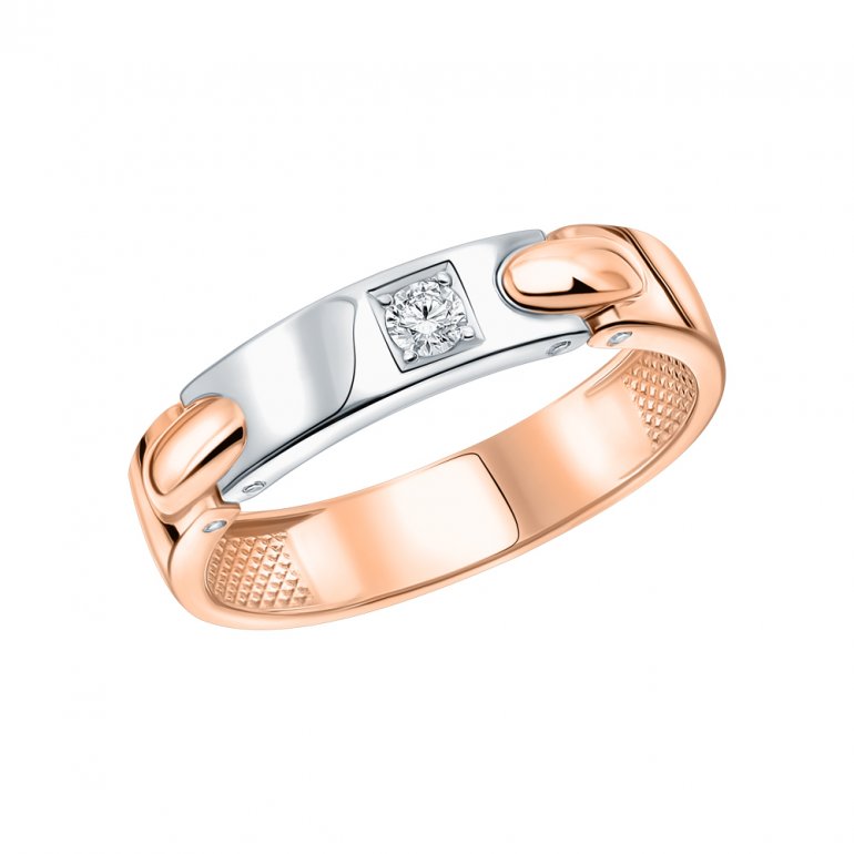 Кольцо с 1 бриллиантом, 0.097 карат, огранка круг 57 граней, цвет 3, чистота 6, тип огранки А; 8 бриллиантами, 0.028 карат, огранка круг 17 граней, цвет 2, чистота 2, тип огранки А; Розовое и белое золото 585 пробы.