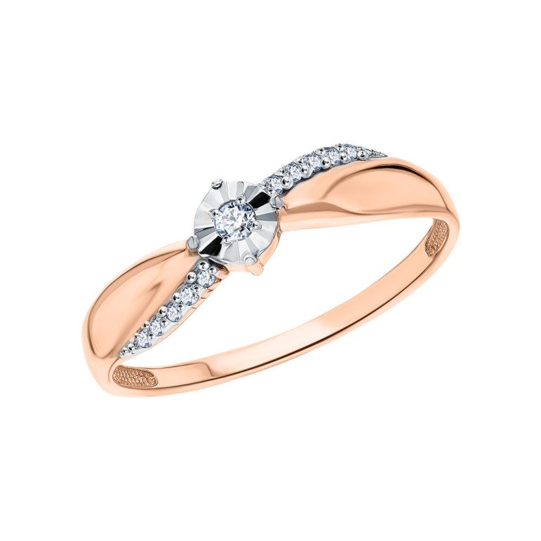 Кольцо с 1 бриллиантом, 0.032 карат, огранка круг 57 граней, цвет 3, чистота 6, тип огранки А; 10 бриллиантами, 0.049 карат, огранка круг 17 граней, цвет 2, чистота 2, тип огранки А; Розовое и белое золото 375 пробы.