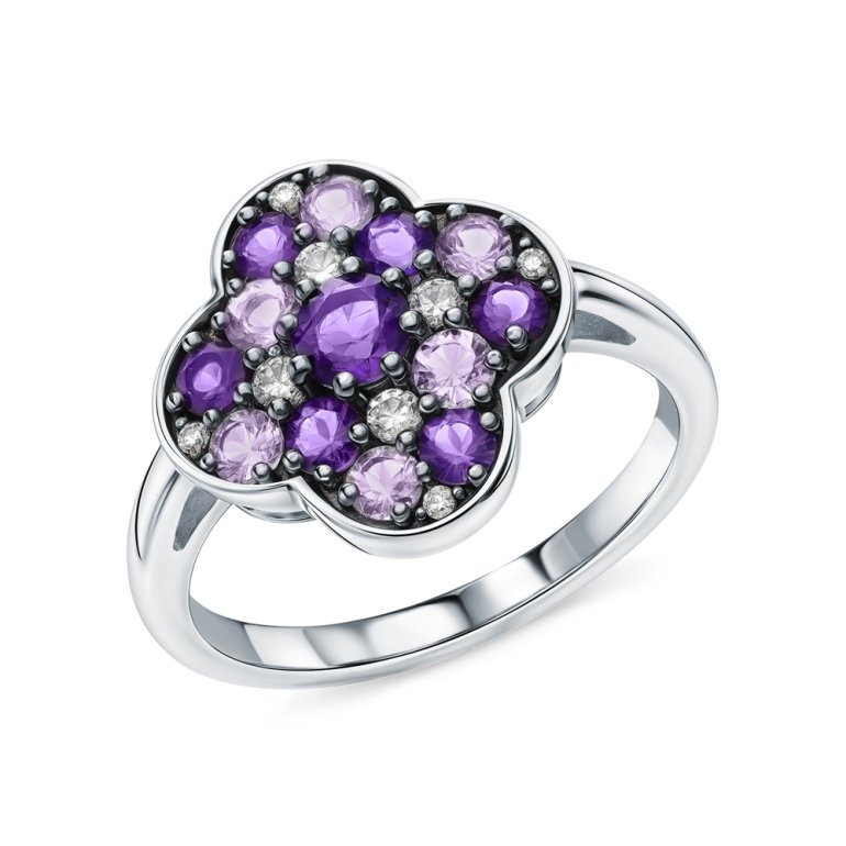 Кольцо с 13 аметистами природными, 0.76 карат;  фианитом бесцветным; Серебро 925 пробы.