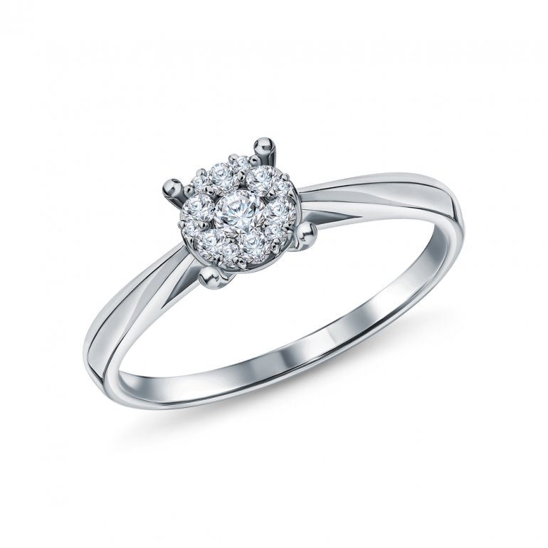 Кольцо с 1 бриллиантом природным, 0.044 карат, огранка круг 57 граней, цвет 3, чистота 5, тип огранки А; 6 бриллиантами природными, 0.058 карат, огранка круг 57 граней, цвет 3, чистота 5, тип огранки А; 6 бриллиантами природными, 0.021 карат, огранка круг 57 граней, цвет 3, чистота 5, тип огранки А; Белое золото 585 пробы.