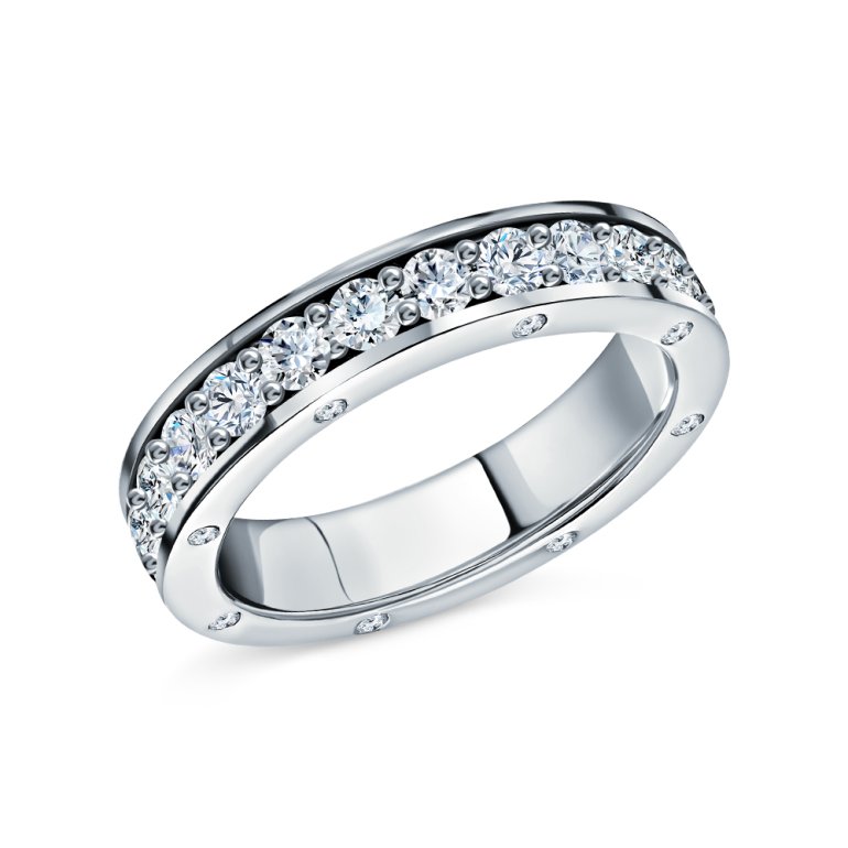 Кольцо с 24 бриллиантами природными, 0.96 карат, огранка круг 57 граней, цвет 3, чистота 6, тип огранки А; 16 бриллиантами природными, 0.09 карат, огранка круг 17 граней, цвет 2, чистота 3, тип огранки Б; Белое золото 585 пробы.