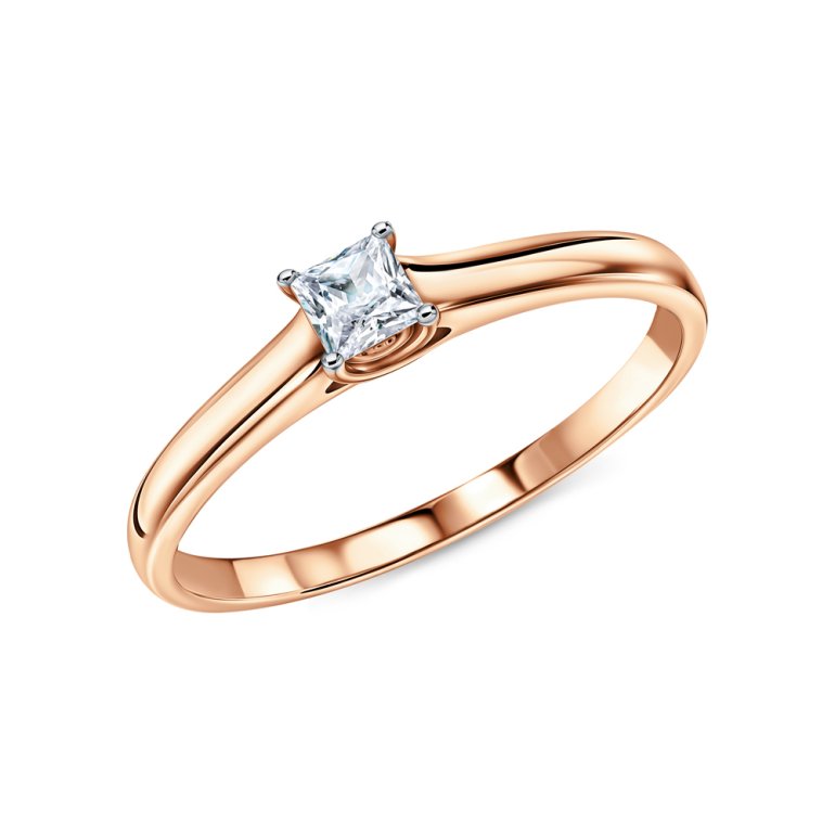 Кольцо с 1 бриллиантом природным, 0.156 карат, огранка принцесса 65 граней, цвет 3, чистота 6, тип огранки А; Розовое золото 585 пробы.
