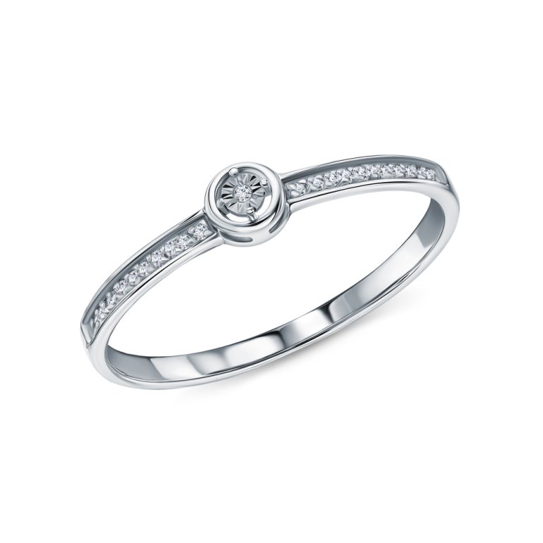 Кольцо с 1 бриллиантом, 0.002 карат, огранка круг 17 граней, цвет 2, чистота 2, тип огранки А; 22 бриллиантами, 0.041 карат, огранка круг 17 граней, цвет 2, чистота 2, тип огранки А; Белое золото 585 пробы.