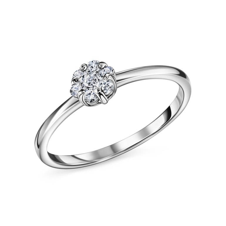 Кольцо с 1 бриллиантом природным, 0.049 карат, огранка круг 57 граней, цвет 5, чистота 6, тип огранки А; 6 бриллиантами природными, 0.123 карат, огранка круг 57 граней, цвет 5, чистота 6, тип огранки А; Белое золото 585 пробы.