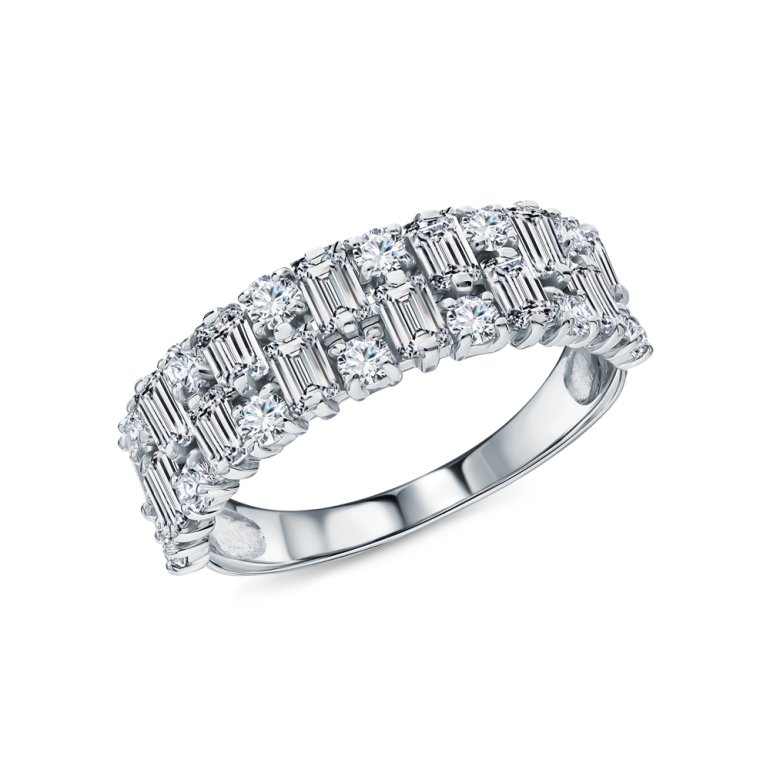 Кольцо с 13 бриллиантами выращенными, 1.134 карат, огранка багет 33 грани, цвет 3, чистота 6, тип огранки А; 13 бриллиантами выращенными, 0.43 карат, огранка круг 57 граней, цвет 3, чистота 6, тип огранки А; Белое золото 585 пробы.