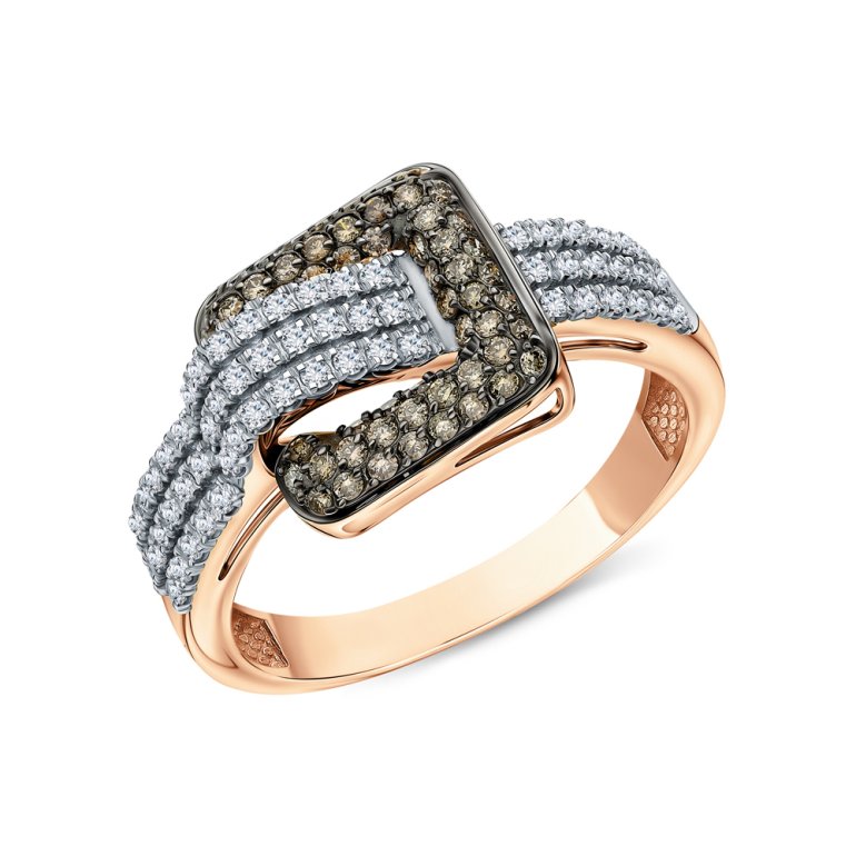 Кольцо с 57 бриллиантами природными, 0.311 карат, огранка круг 17 граней, цвет 2, чистота 2, тип огранки А; 55 бриллиантами коньячными природными, 0.304 карат, огранка круг 57 граней, цвет 7, чистота 5, тип огранки А; 2 бриллиантами коньячными природными, 0.007 карат, огранка круг 57 граней, цвет 7, чистота 5, тип огранки А; Розовое золото 585 пробы.