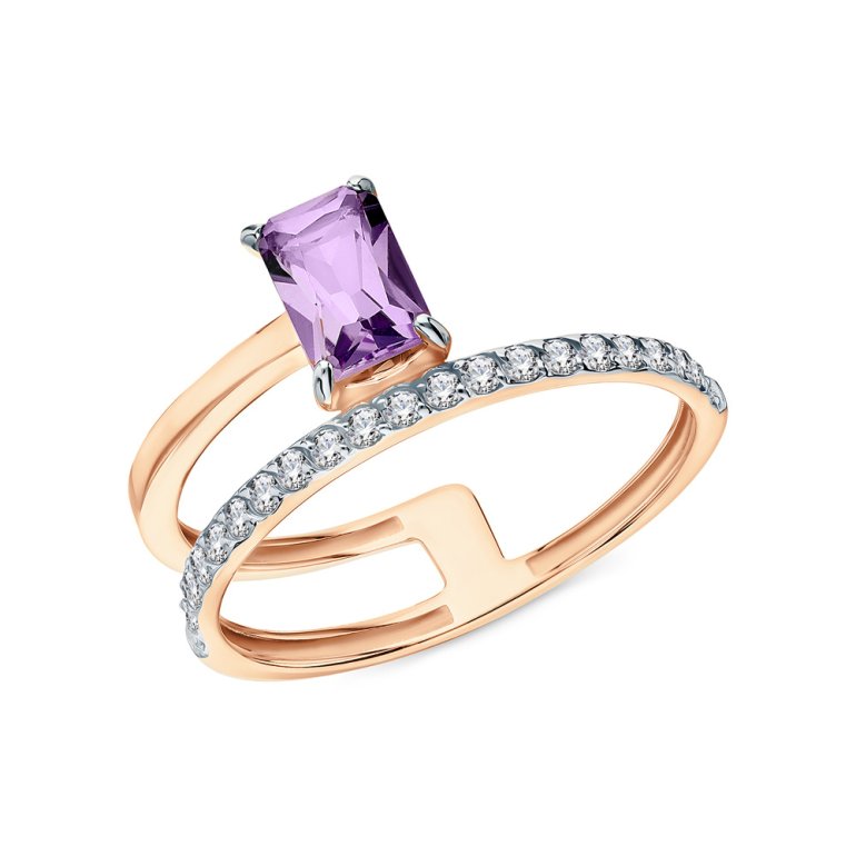 Кольцо с 1 аметистом природным, 0.521 карат, тип огранки Б; фианитом бесцветным; Розовое золото 585 пробы.