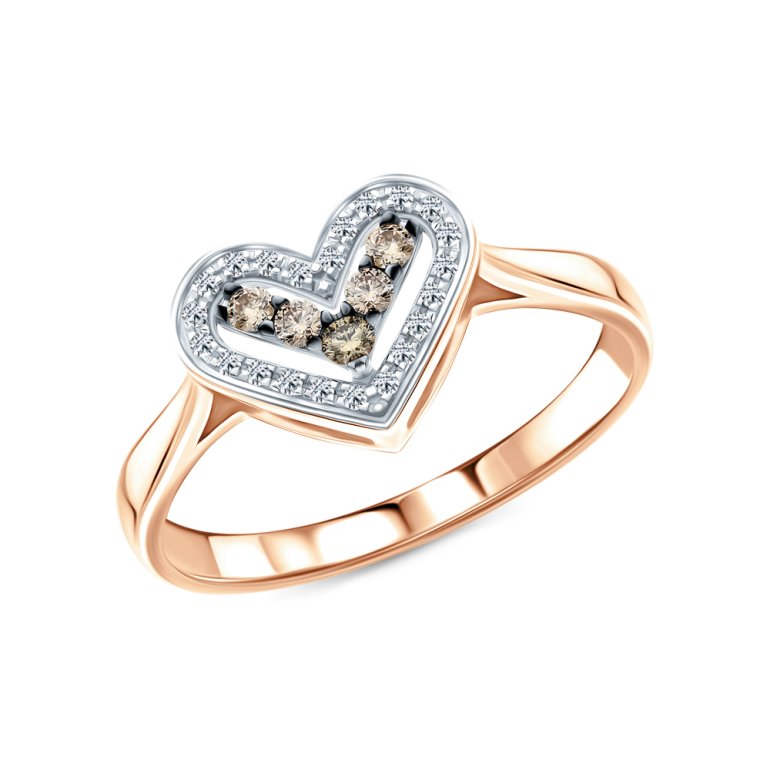 Кольцо с 22 бриллиантами природными, 0.048 карат, огранка круг 17 граней, цвет 2, чистота 2, тип огранки А; 5 бриллиантами коньячными природными, 0.067 карат, огранка круг 57 граней, цвет 7, чистота 5, тип огранки А; Розовое золото 585 пробы.