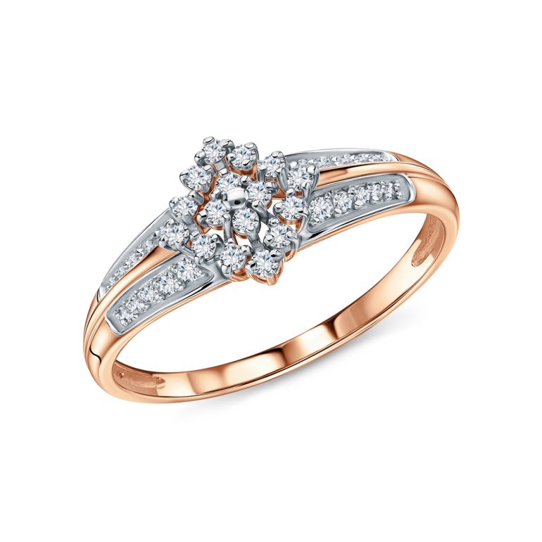 Кольцо с 16 бриллиантами, 0.114 карат, огранка круг 57 граней, цвет 3, чистота 6, тип огранки А; 4 бриллиантами, 0.026 карат, огранка круг 57 граней, цвет 3, чистота 6, тип огранки А; 4 бриллиантами, 0.02 карат, огранка круг 17 граней, цвет 2, чистота 2, тип огранки А; 4 бриллиантами, 0.012 карат, огранка круг 17 граней, цвет 2, чистота 2, тип огранки А; 8 бриллиантами, 0.017 карат, огранка круг 17 граней, цвет 2, чистота 2, тип огранки А; Розовое золото 585 пробы.