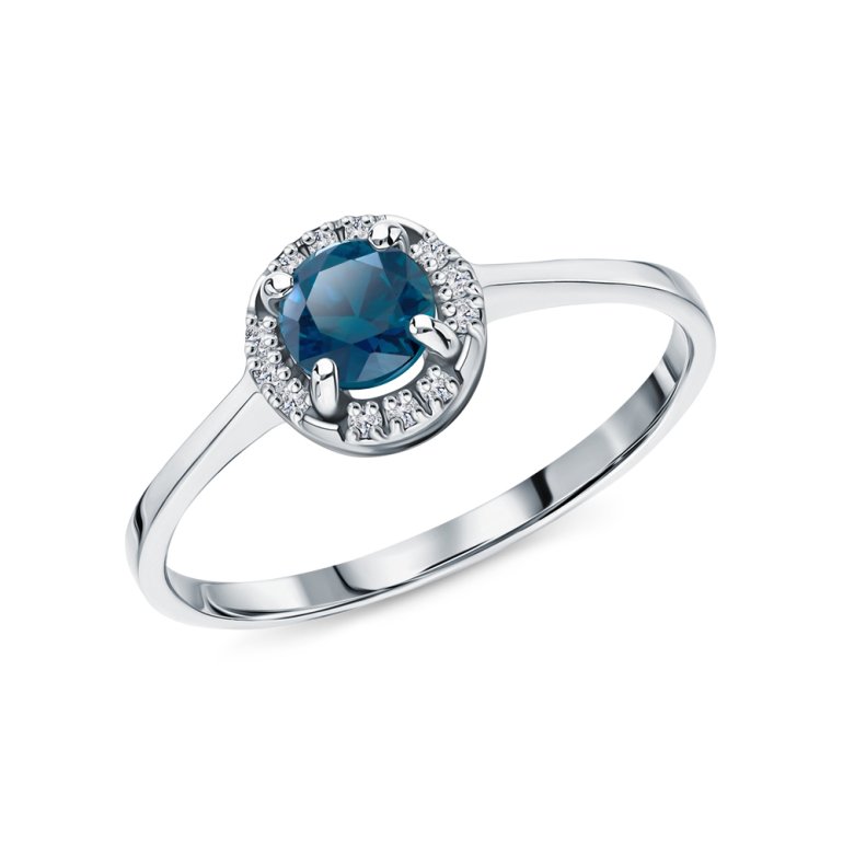 Кольцо с 1 топазом лондон природным, 0.306 карат, тип огранки В; 12 бриллиантами, 0.03 карат, огранка круг 17 граней, цвет 2, чистота 2, тип огранки А; Белое золото 585 пробы.