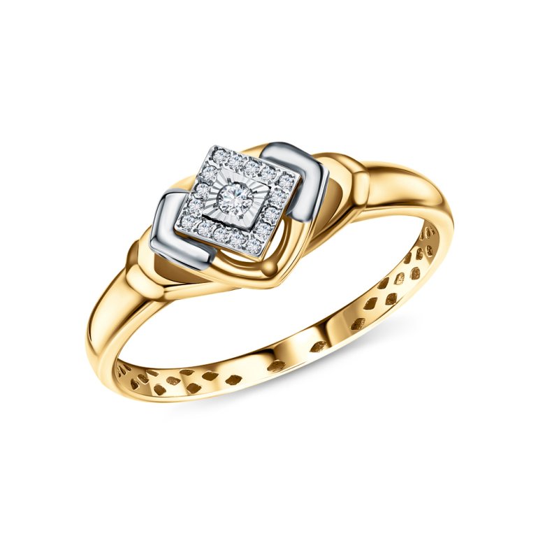 Кольцо с 1 бриллиантом природным, 0.018 карат, огранка круг 57 граней, цвет 3, чистота 6, тип огранки А; 16 бриллиантами природными, 0.029 карат, огранка круг 17 граней, цвет 2, чистота 2, тип огранки А; Желтое и белое золото 585 пробы.