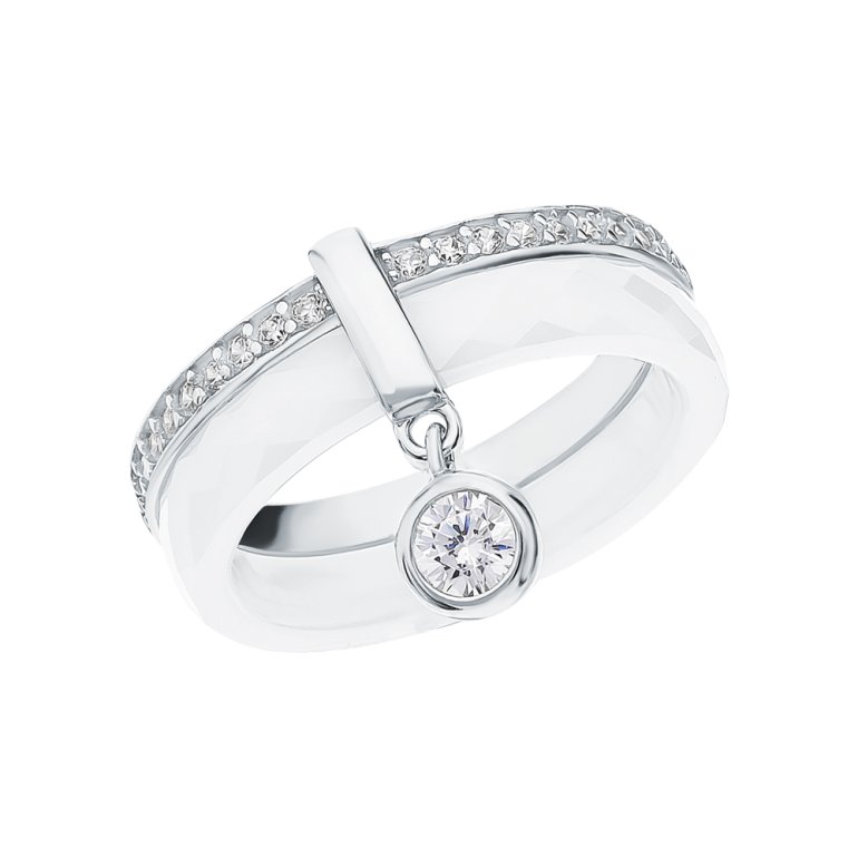 Кольцо, вставка: фианитом бесцветным;  керамика белая; Серебро 925 пробы.