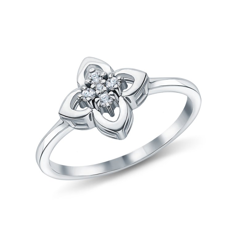 Кольцо с 5 бриллиантами выращенными, 0.07 карат, огранка круг 57 граней, цвет 3, чистота 5, тип огранки А; Серебро 925 пробы.