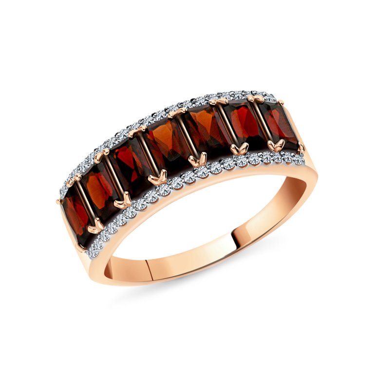 Кольцо с 7 гранатами, 2.303 карат, тип огранки Б; 40 бриллиантами, 0.136 карат, огранка круг 17 граней, цвет 2, чистота 2, тип огранки А; Розовое золото 585 пробы.