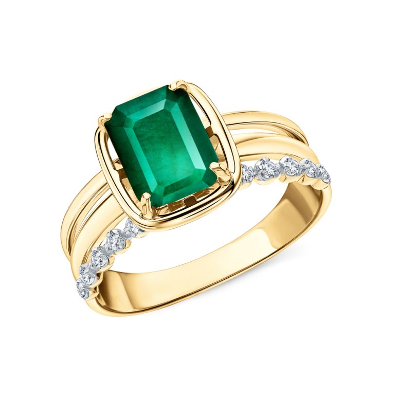 Кольцо с 1 изумрудом природным, 1.25 карат, цвет 3, чистота 3, тип огранки Б; 10 бриллиантами, 0.078 карат, огранка круг 57 граней, цвет 3, чистота 6, тип огранки А; Желтое золото 750 пробы.