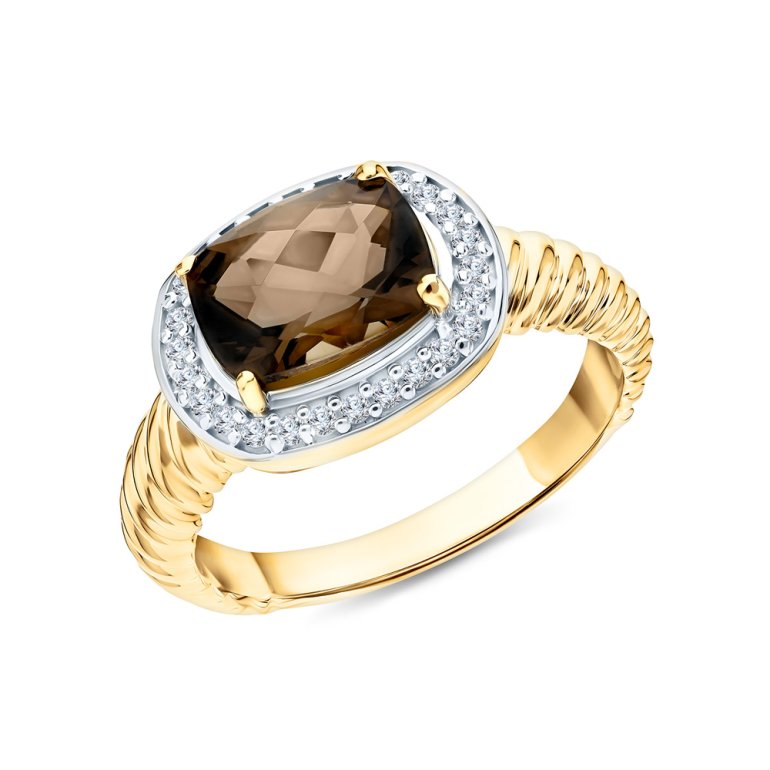 Кольцо с 1 кварцем дымчатым природным, 1.3 карат;  фианитом бесцветным; Серебро 925 пробы.