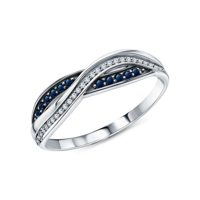 Кольцо с 24 бриллиантами природными, 0.06 карат, огранка круг 17 граней, цвет 2, чистота 3, тип огранки Б; 11 сапфирами природными, 0.121 карат, цвет 3, чистота 4, тип огранки В; Белое золото 585 пробы.