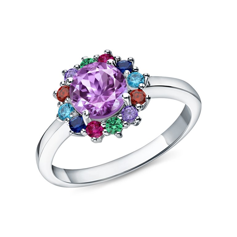 Серебряное кольцо с фианитами и аметистами природными