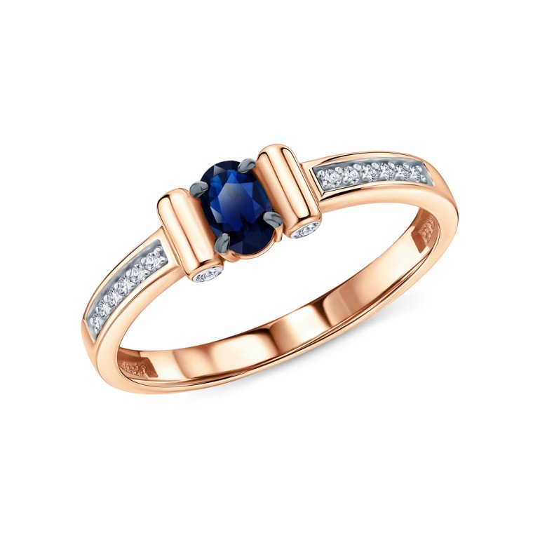 Кольцо с 4 бриллиантами природными, 0.032 карат, огранка круг 17 граней, цвет 2, чистота 2, тип огранки А; 12 бриллиантами природными, 0.048 карат, огранка круг 17 граней, цвет 2, чистота 2, тип огранки А; 1 сапфиром синтетическим, 0.272 карат, тип огранки Б; Розовое золото 585 пробы.
