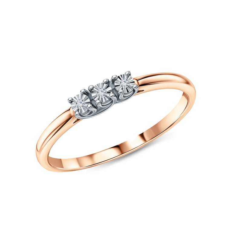 Кольцо с 3 бриллиантами, 0.01 карат, огранка круг 17 граней, цвет 2, чистота 2, тип огранки Б; Розовое золото 585 пробы.