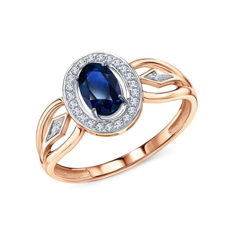 Кольцо с 1 сапфиром природным, 0.575 карат, цвет 2, чистота 2, тип огранки Б; 25 бриллиантами, 0.083 карат, огранка круг 17 граней, цвет 2, чистота 2, тип огранки А; Розовое золото 585 пробы.