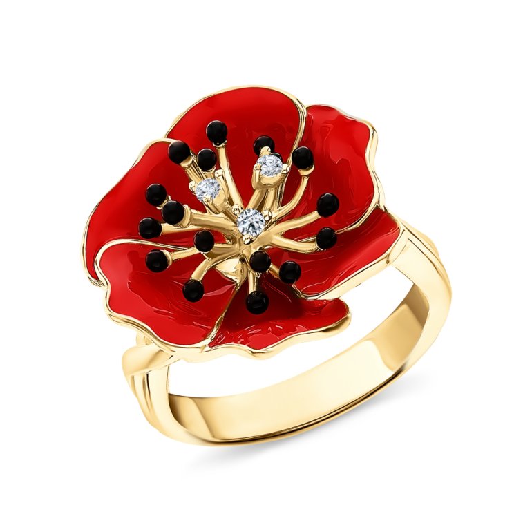 Кольцо, вставка: фианит бесцветный;  эмаль красная;  эмаль черная; Серебро 925 пробы.