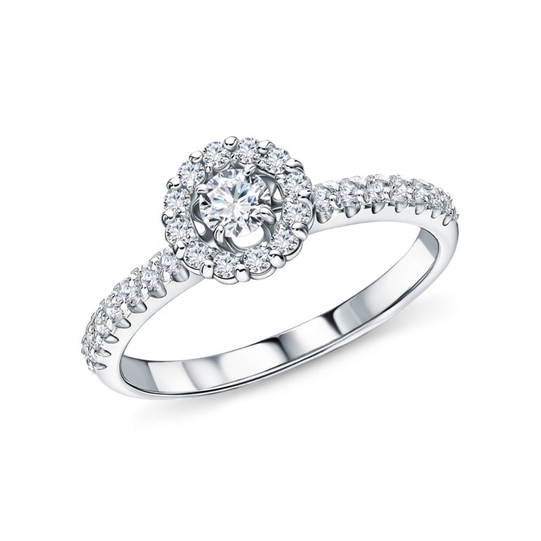 Кольцо с 1 бриллиантом, 0.135 карат, огранка круг 57 граней, цвет 3, чистота 6, тип огранки А; 26 бриллиантами, 0.24 карат, огранка круг 57 граней, цвет 3, чистота 6, тип огранки А; Белое золото 585 пробы.