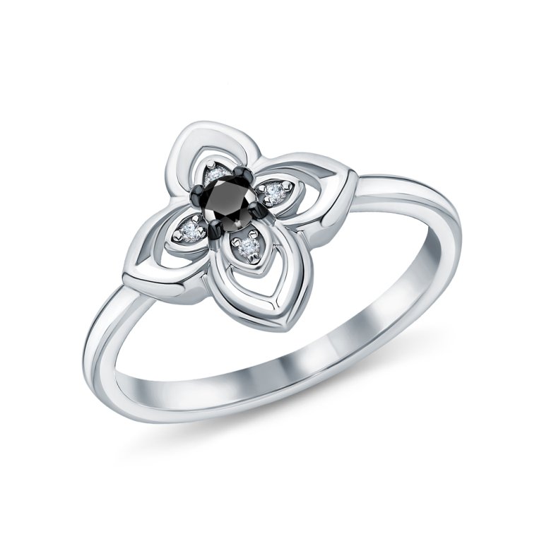 Кольцо с 1 шпинелью черной природной, 0.1 карат;  фианитом бесцветным; Серебро 925 пробы.
