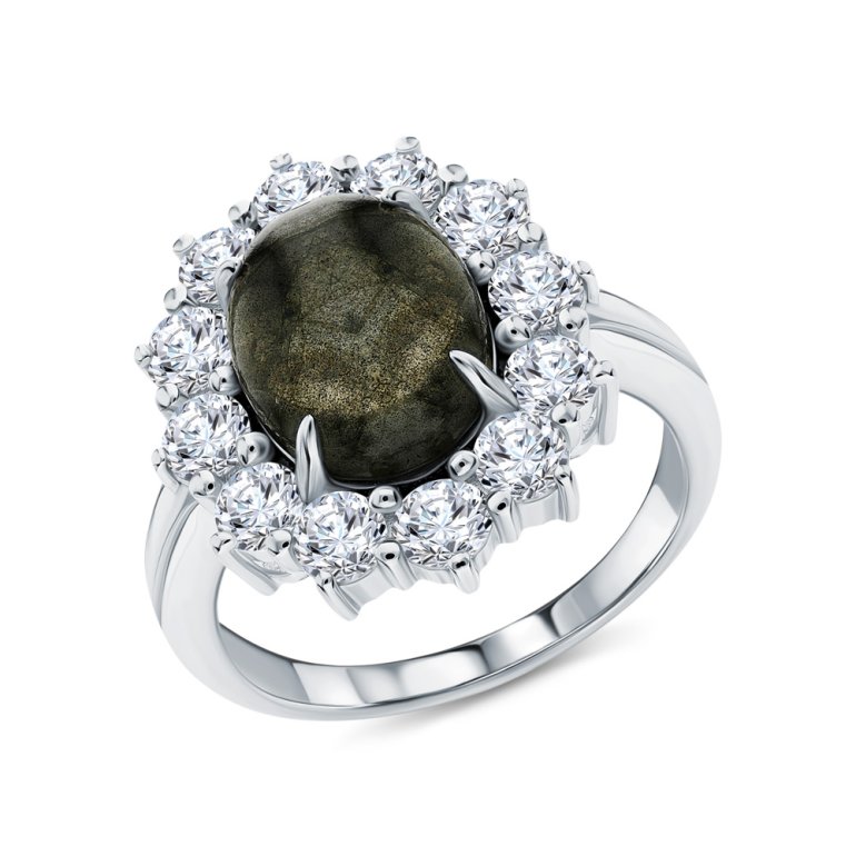 Кольцо с 1 лабрадоритом; фианитом бесцветным; Серебро 925 пробы.