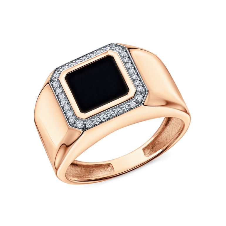 Кольцо с 32 бриллиантами природными, 0.154 карат, огранка круг 17 граней, цвет 2, чистота 2, тип огранки А; 1 агатом черным природным, 1.33 карат, тип огранки Б; Розовое золото 585 пробы.