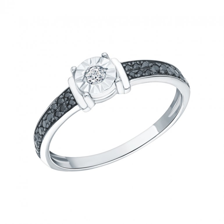 Кольцо с 1 бриллиантом природным, 0.032 карат, огранка круг 57 граней, цвет 4, чистота 5, тип огранки А; 12 бриллиантами черными природными облагороженными, 0.053 карат, огранка круг 57 граней, цвет 7, чистота 6, тип огранки А; 12 бриллиантами черными природными облагороженными, 0.031 карат, огранка круг 57 граней, цвет 7, чистота 6, тип огранки А; Белое золото 585 пробы.