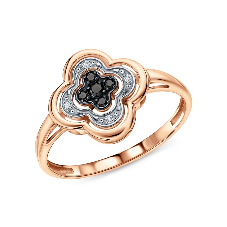 Кольцо с 4 бриллиантами природными, 0.014 карат, огранка круг 17 граней, цвет 2, чистота 2, тип огранки А; 1 бриллиантом черным природным облагороженным, 0.022 карат, огранка круг 57 граней, цвет 7, чистота 6, тип огранки А; 4 бриллиантами черными природными облагороженными, 0.031 карат, огранка круг 57 граней, цвет 7, чистота 6, тип огранки А; Розовое золото 585 пробы.