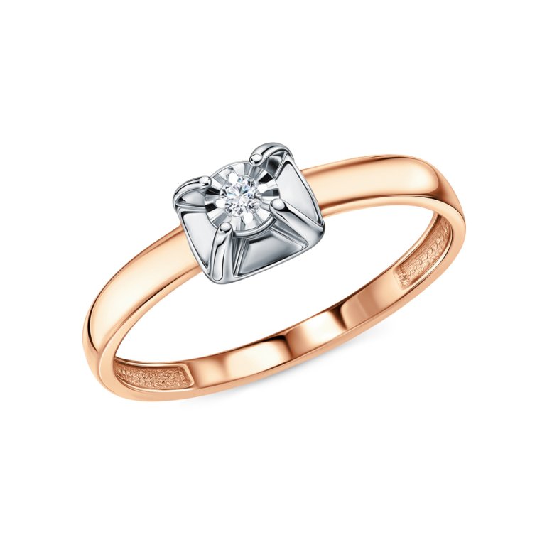 Кольцо с 1 бриллиантом природным, 0.022 карат, огранка круг 57 граней, цвет 3, чистота 6, тип огранки А; Розовое и белое золото 375 пробы.